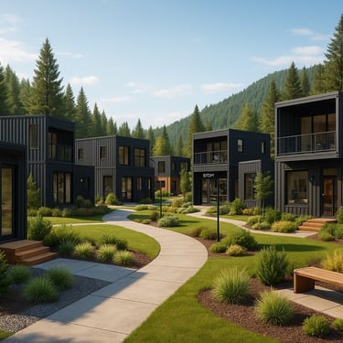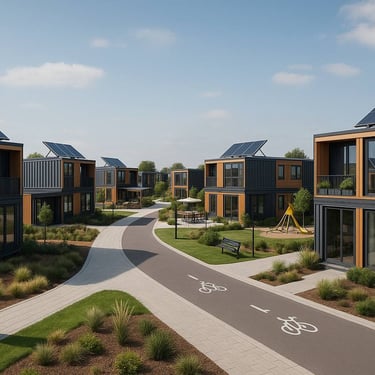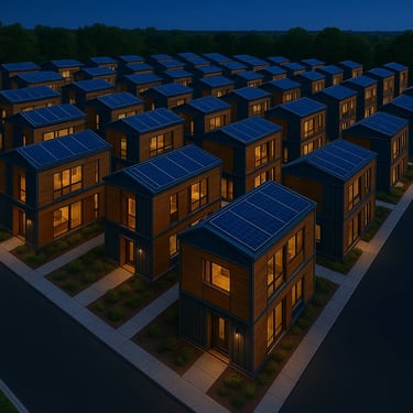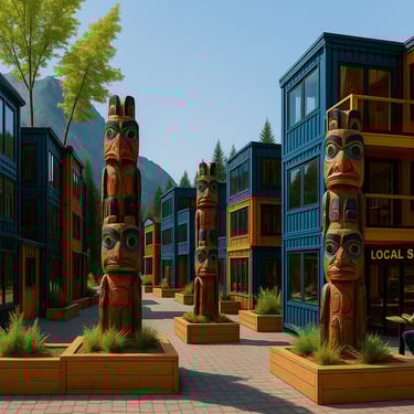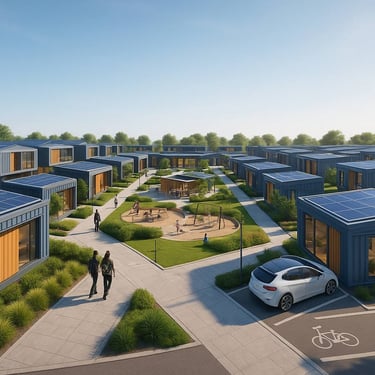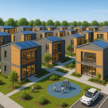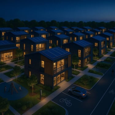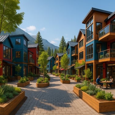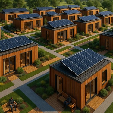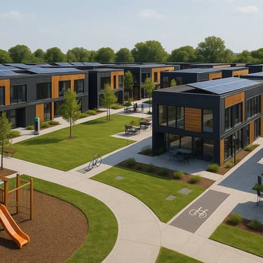 Community-Centered Design features thoughtfully planned village layouts with walkways, shared gardens, and centralized service hubs, adaptable to urban, rural, or remote First Nations land.